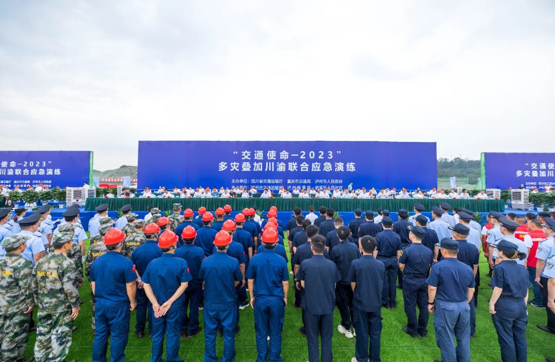 本次演練是以模擬瀘州市與重慶市交界處發(fā)生6.9級地震,且疊加震后強降雨,長江流域水面大幅上漲形成洪澇災害,造成公路阻斷、橋梁損毀,船舶遇險為背景,采取川渝聯(lián)合、省市聯(lián)動和視頻實操結(jié)合的方式,重點演練應急響應、建設項目緊急避險、陸上應急通道搶通和救援裝備登船、失控船舶攔截拖帶、船舶消防、公路搶通作業(yè)、陸上裝備展示、列隊檢閱等8個科目。