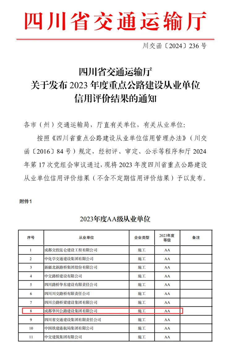6月4日,四川省交通運輸廳公布了2023年度重點公路建設從業(yè)單位信用評價結果,集團再次榮獲最高等級“AA級”,也是自2015年以來連續(xù)9年獲得該最高等級評級。